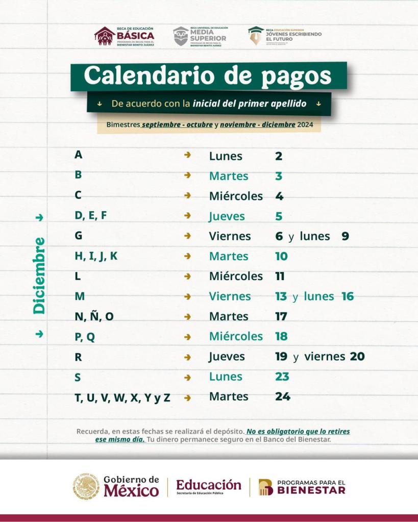 Xalapa., Ver., 02 de diciembre de 2024.- Tal como lo anunció la Presidenta de México, Claudia Sheinbaum Pardo y el Secretario de Educación, Mario Delgado Carrillo, en la mañanera del pueblo, en este mes de diciembre inicia el pago de las Becas para el Bienestar de las y los beneficiarios de continuidad de las Becas para el Bienestar de los 3 niveles educativos. El periodo de pago será del lunes dos de diciembre al martes veinticuatro de diciembre y se realizará el depósito de los dos últimos bimestres del año (septiembre – octubre y noviembre – diciembre).