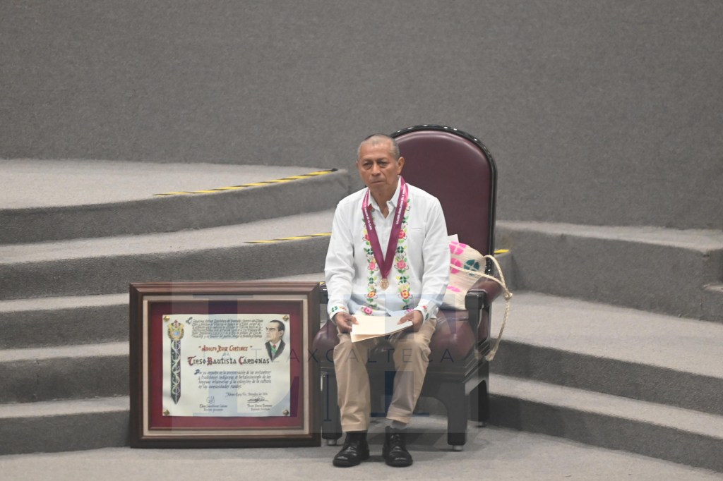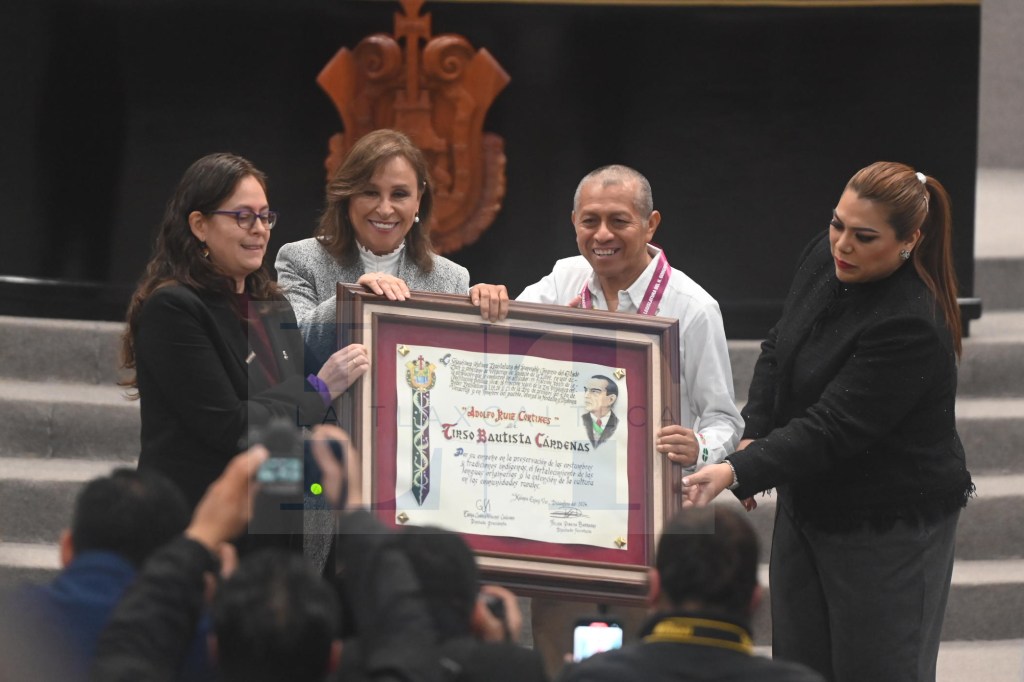 Xalapa, Ver., 09 de enero de 2025.- En sesión solemne, la LXVII Legislatura entregó la Medalla y Diploma Adolfo Ruiz Cortines, edición 2024, al profesor y promotor de la interculturalidad educativa, Tirso Bautista Cárdenas, como reconocimiento a su labor y empeño en la preservación de las costumbres y tradiciones indígenas, el fortalecimiento de las lenguas originarias y la extensión de la cultura en las comunidades rurales.