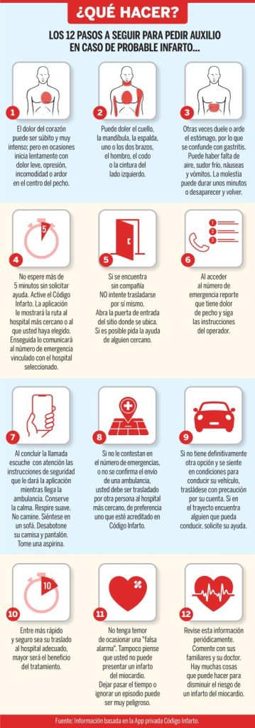 A decir de Borrayo Sánchez, los primeros 60 minutos tras un infarto son cruciales y por ello se les conoce como “la hora dorada”. Para recibir atención en dicho lapso es preciso saber qué hospitales cuentan con Código Infarto, lo cual puede hacerse desde la aplicación IMSS Digital. “El beneficio se extiende hasta las primeras 12 horas tras el inicio de los síntomas, pero conforme pasa el tiempo es progresivamente menor”.