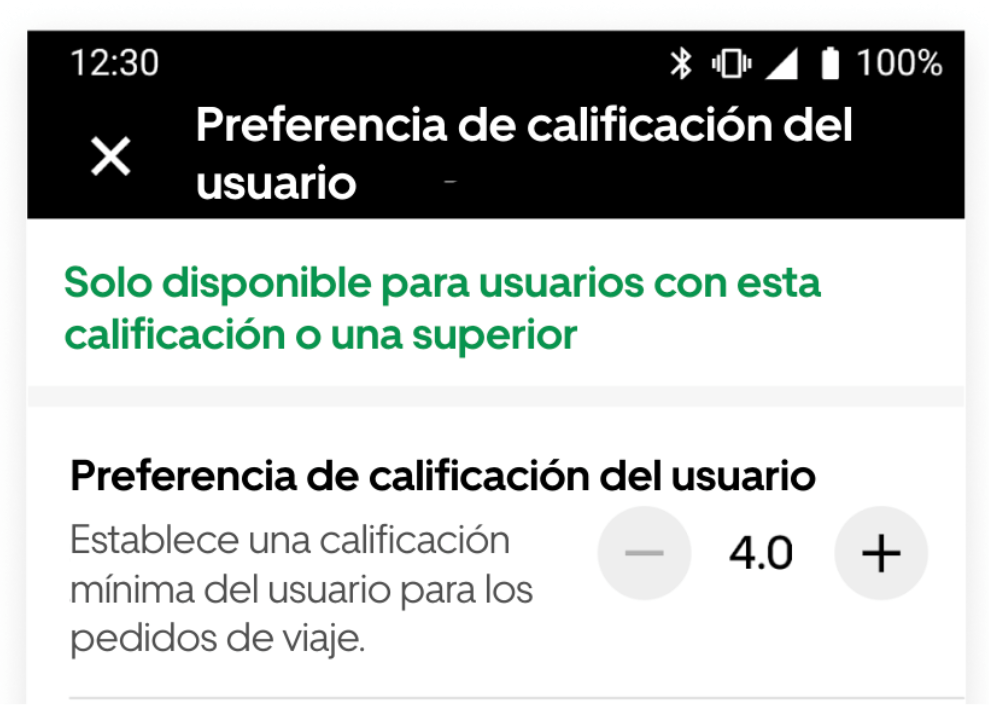 Además, los conductores cuentan con la posibilidad de filtrar las solicitudes de viajes a partir de determinada calificación mínima de los usuarios. Este parámetro puede ser modificado en cualquier momento por el mismo socio conductor, y se encuentra en la app de socios conductores en la sección ‘Preferencias de Viaje’ > “Calificación de usuario/a”.