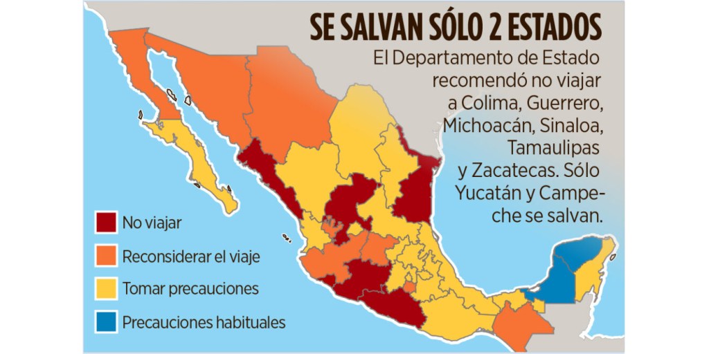 El Departamento de Estado de EU advirtió ayer a sus ciudadanos de riesgo de incidentes de violencia terrorista en 30 de las 32 entidades de México -excluyendo a Yucatán y Campeche- como parte de la actualización de su alerta anual de viaje.