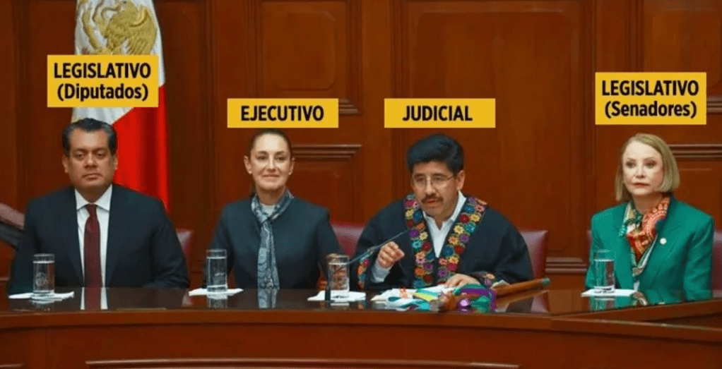 El Ejecutivo, encabezado por la Presidenta Claudia Sheinbaum; el Congreso, bajo conducción del diputado Sergio Gutiérrez y de la senadora Laura Itzel Castillo, ambos de Morena; y una nueva Suprema Corte, presidida por Hugo Aguilar, ex funcionario en la gestión de Andrés Manuel López Obrador, configuran la nueva estructura de poder. Anoche, en el salón de plenos de la Corte, las cuatro figuras simbolizaron la nueva relación denominada de «colaboración institucional» tras años de confrontación y descalificación del Gobierno de la 4T con el Poder Judicial.