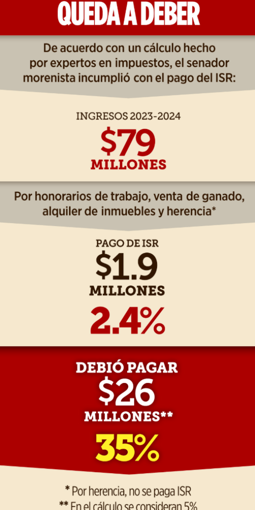 De 79 millones de pesos que López Hernández reportó cobrar en esos dos años, debió cubrir 26 millones de pesos de Impuesto Sobre la Renta, según un cálculo hecho por los especialistas, considerando los ingresos que él mismo reconoció tener por servicios profesionales, venta de ganado, renta de inmuebles y herencias, este último rubro no es gravado con ISR.