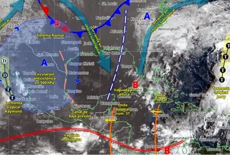 «La onda tropical núm. 37 se desplazará lentamente al sur de la Península de Yucatán y continuará interactuando con una vaguada en altura, manteniendo las condiciones para lluvias puntuales fuertes en Campeche, Yucatán y Quintana Roo», añadió el SMN.