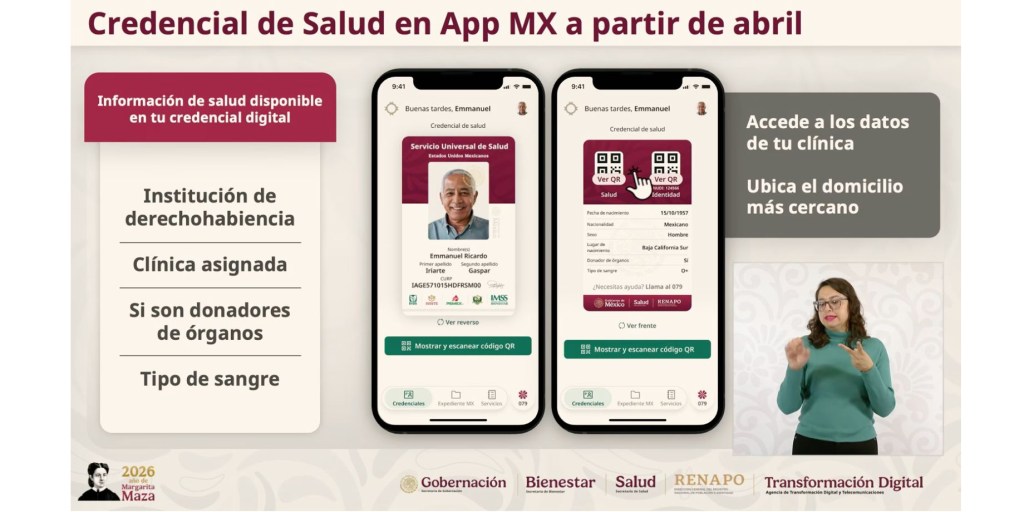 Detalló que la credencial permitirá el acceso a servicios del IMSS, ISSSTE, IMSS-Bienestar, institutos nacionales de salud, servicios médicos de Pemex y de las Fuerzas Armadas, es decir, a toda la infraestructura de salud del Gobierno federal.